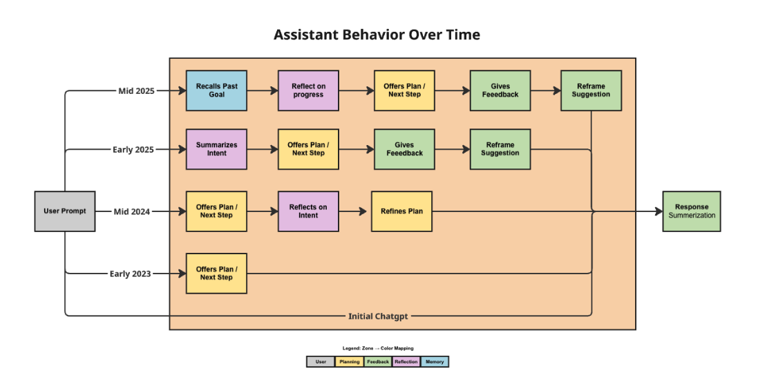 - Emergence of Functions: The framework successfully tracked how the assistant’s behavior evolved from simple, linear responses to a stable set of functions. Planning (≈4,200 instances) and Response (≈4,000 instances) were the most frequent zones.